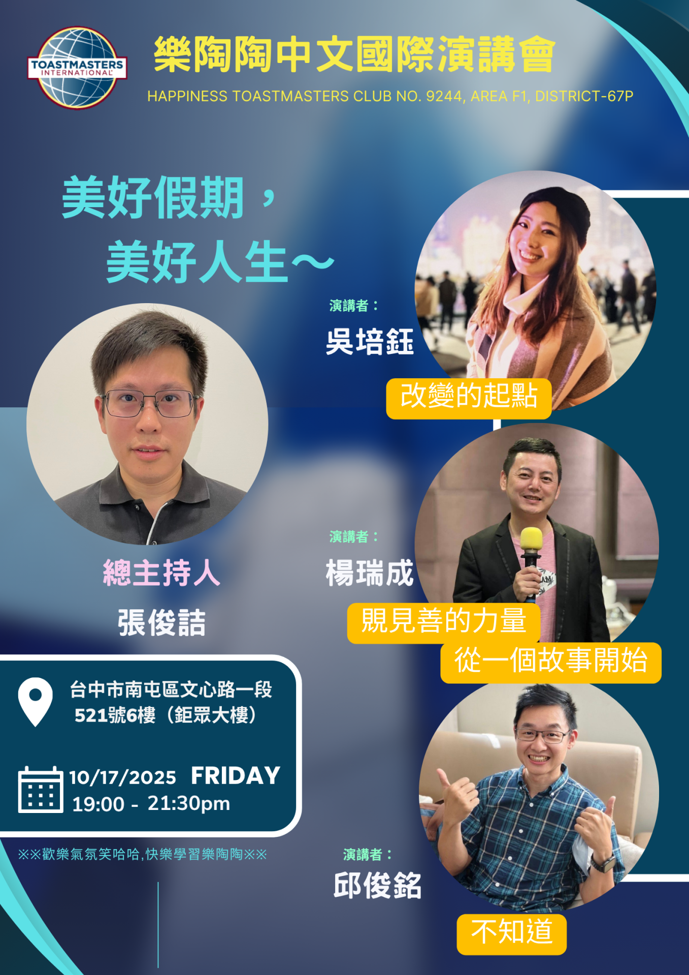 2025年10月17日(五)晚間19:00至21:30,位於台中市南屯區文心路一段521號6樓(鉅眾大樓)的【樂陶陶中文國際演講會】即將舉辦第681次例會。這是一場融合學習、分享與情感交流的語言盛宴,吸引許多對口語表達與領導力成長有興趣的民眾共襄盛舉。此次活動主題為「美好假期,美好人生」,希望在週五夜裡,讓每一位與會者都能在故事與掌聲中,找回語言的溫度,也找回人生的節奏。