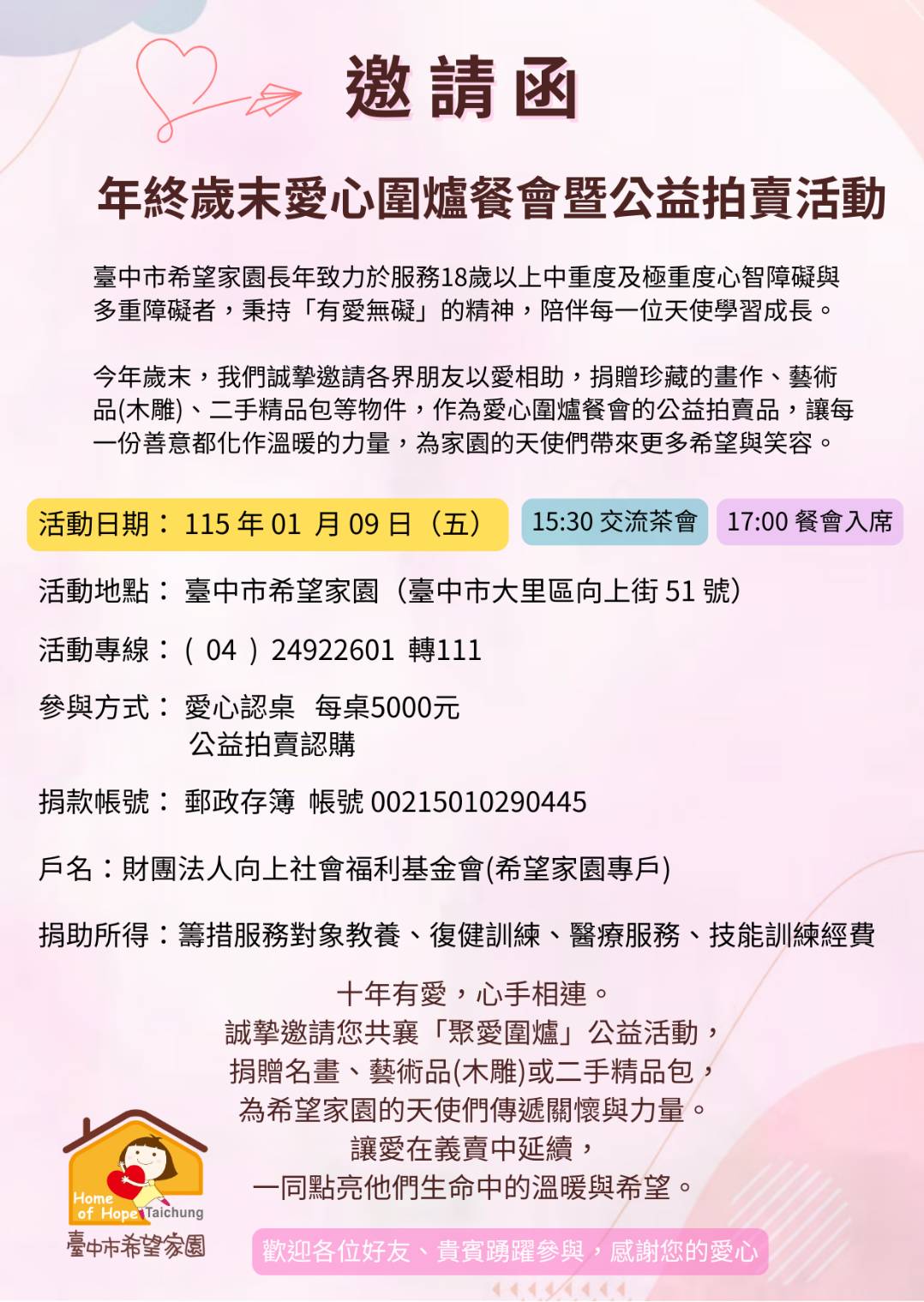 隨著歲末將至,台中的空氣中多了一份溫柔的力量。為了讓愛延續、讓希望傳遞,台中市希望家園 將於 115年1月9日(星期五) 舉辦「年終歲末愛心圍爐餐會暨公益拍賣活動」,誠摯邀請企業團體與愛心人士共襄盛舉,一同為身心障礙朋友點亮冬日的希望之光。