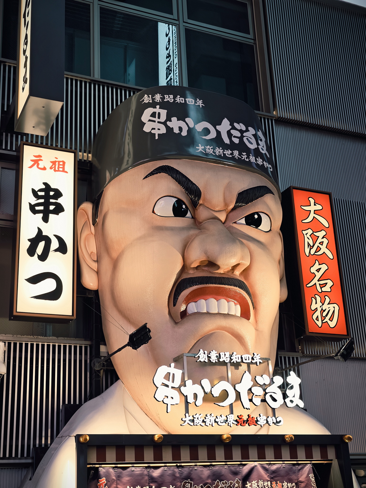 ▲大阪新世界地標「串かつだるま」巨臉招牌霸氣十足,象徵關西人熱情與美食魂/李杰森 先生 攝