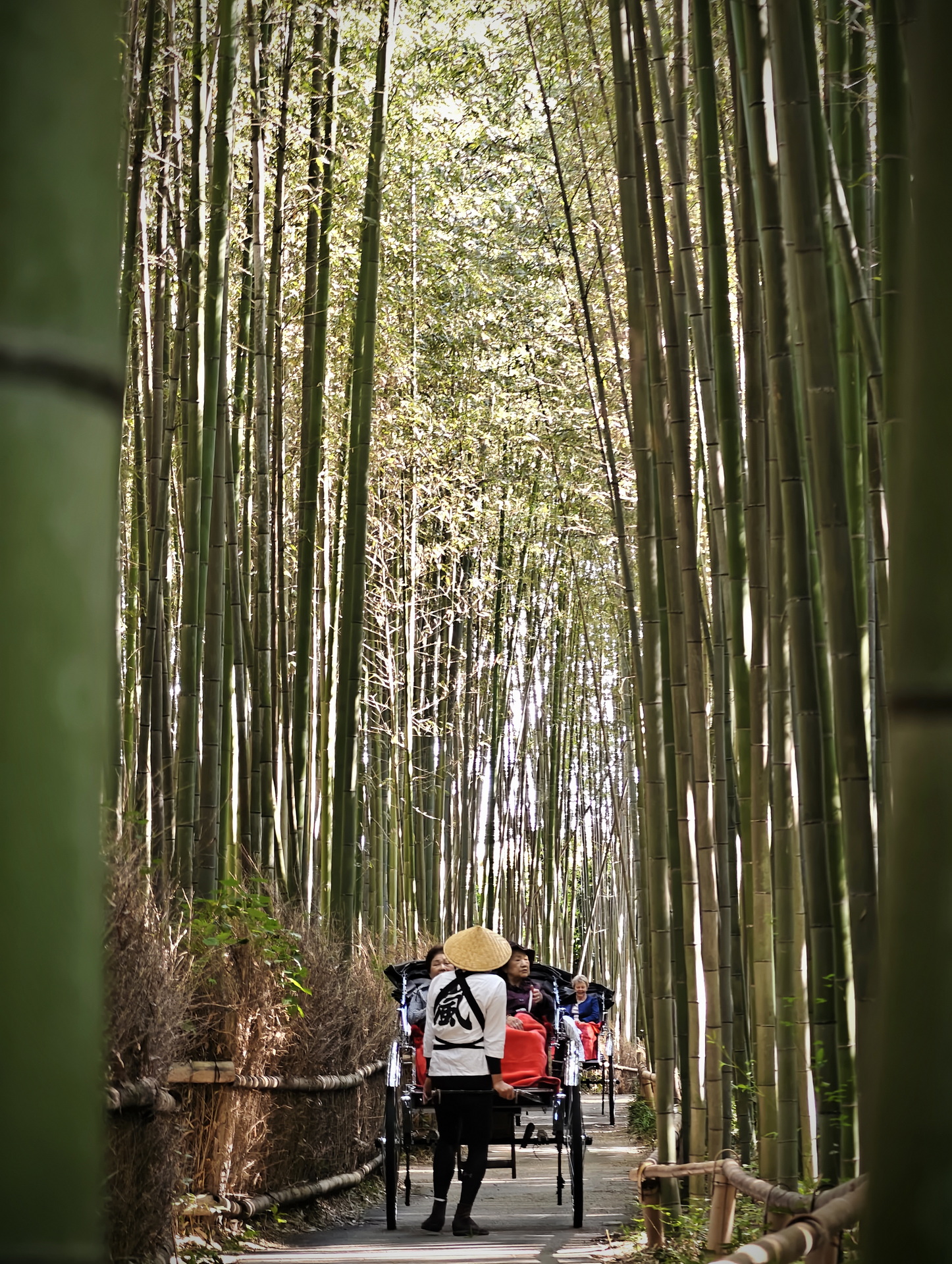 ▲嵐山竹林小徑間的人力車緩緩前行,綠影婆娑,彷彿穿越時光的京都詩境/李杰森 先生 攝