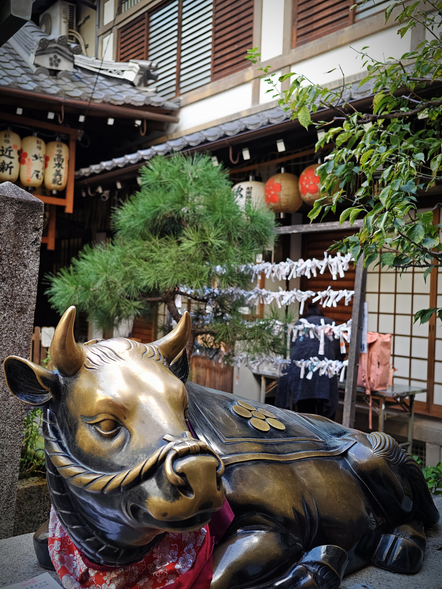 ▲京都北野天滿宮的銅牛神像,傳說撫摸可帶來智慧與好運,閃耀歲月光澤/李杰森 先生 攝