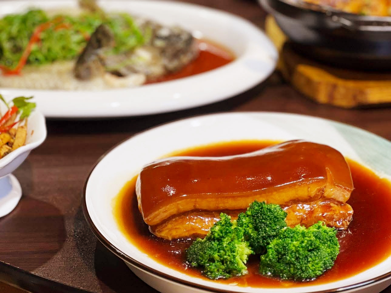 ▲「水粵香」餐廳空間寬敞明亮,設有多間私密包廂,菜色涵蓋冷盤、熱菜、海鮮、大菜與甜點,其中脆皮雞與東坡肉均為米其林等級餐廳菜色之經典再現,讓賓客在豐盛佳餚中共享團聚時光。(圖/業者提供)