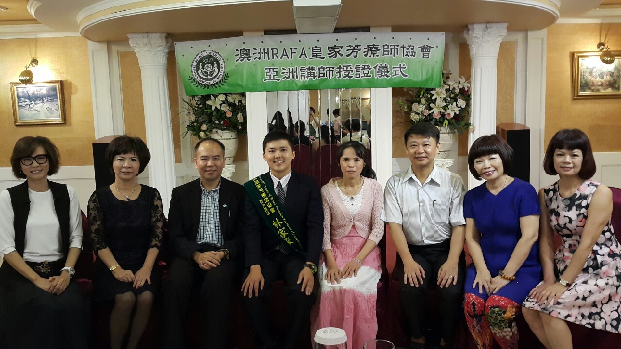 以下兩張照片,紀錄他從芳療學習者踏上國際講師舞台的重要時刻: