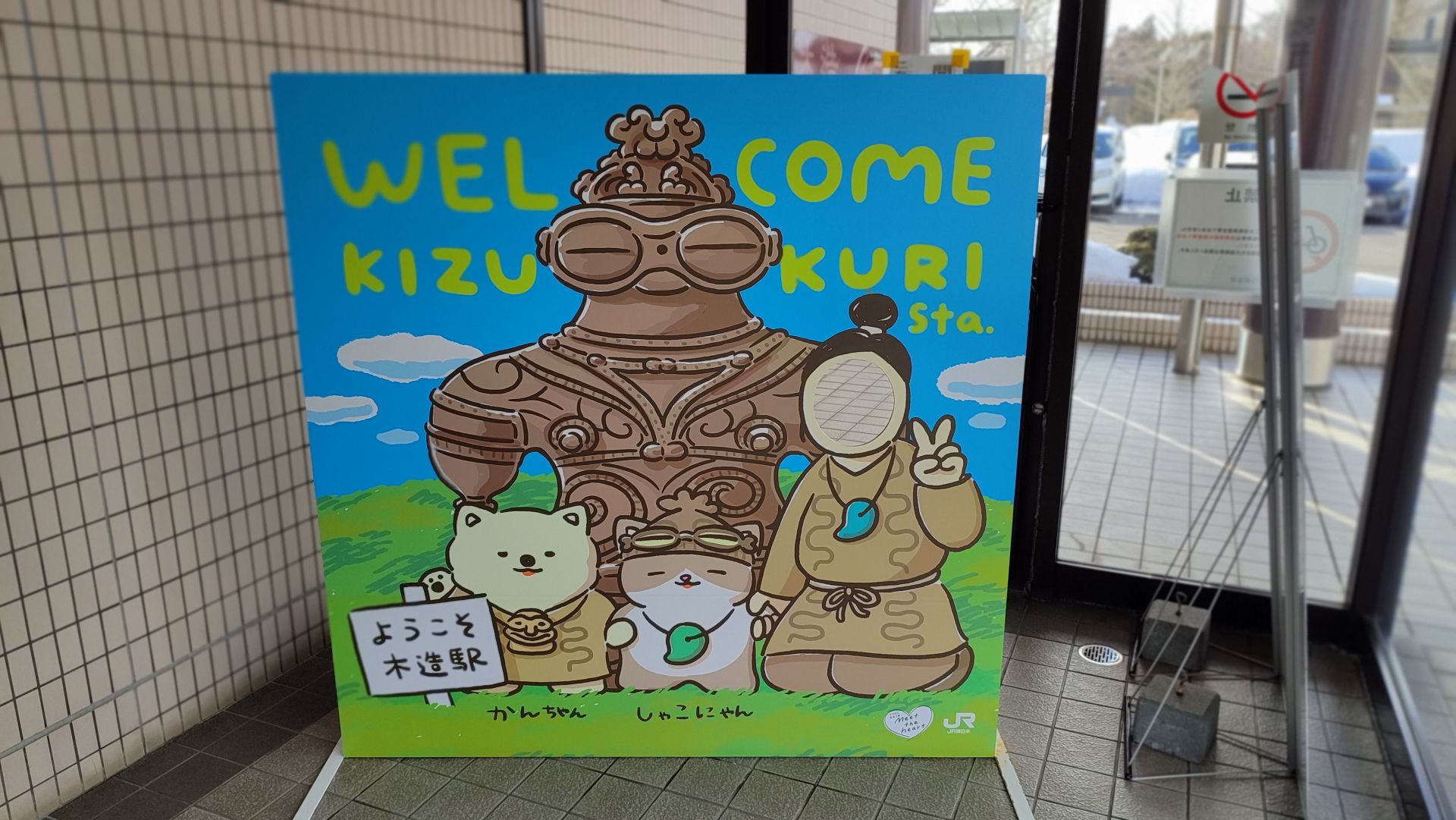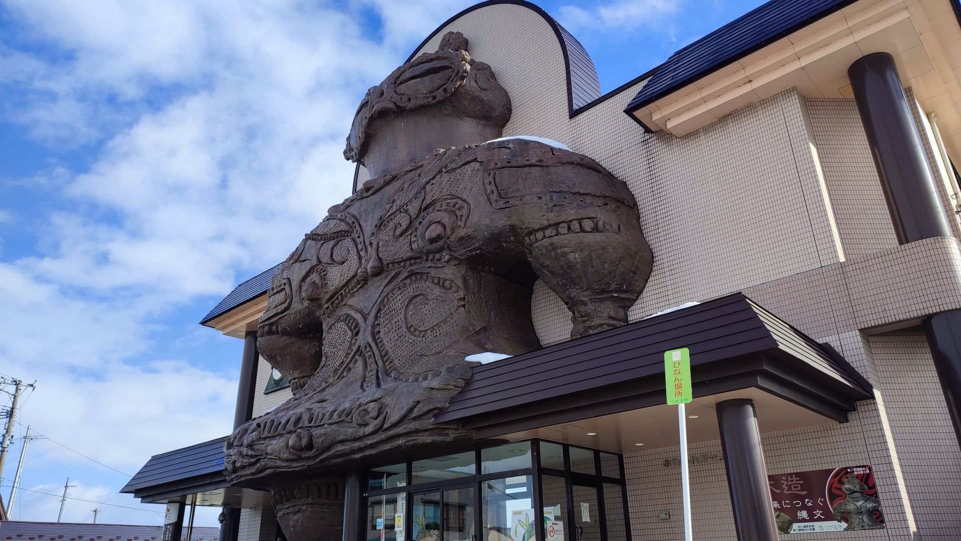 木造站外牆完整重現了青森縣內出土的「遮光器土偶」造型——圓潤身軀、幾何紋飾、標誌性的巨大眼罩,都以等比放大呈現,甚至讓車站本身如同一座走進古代博物館。