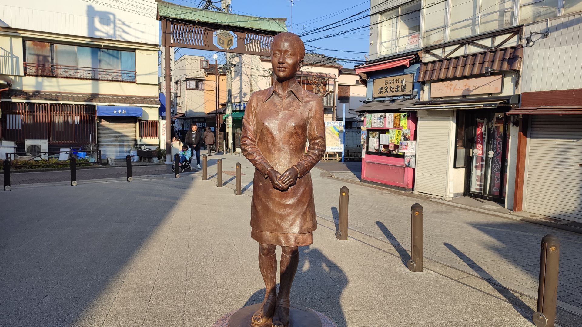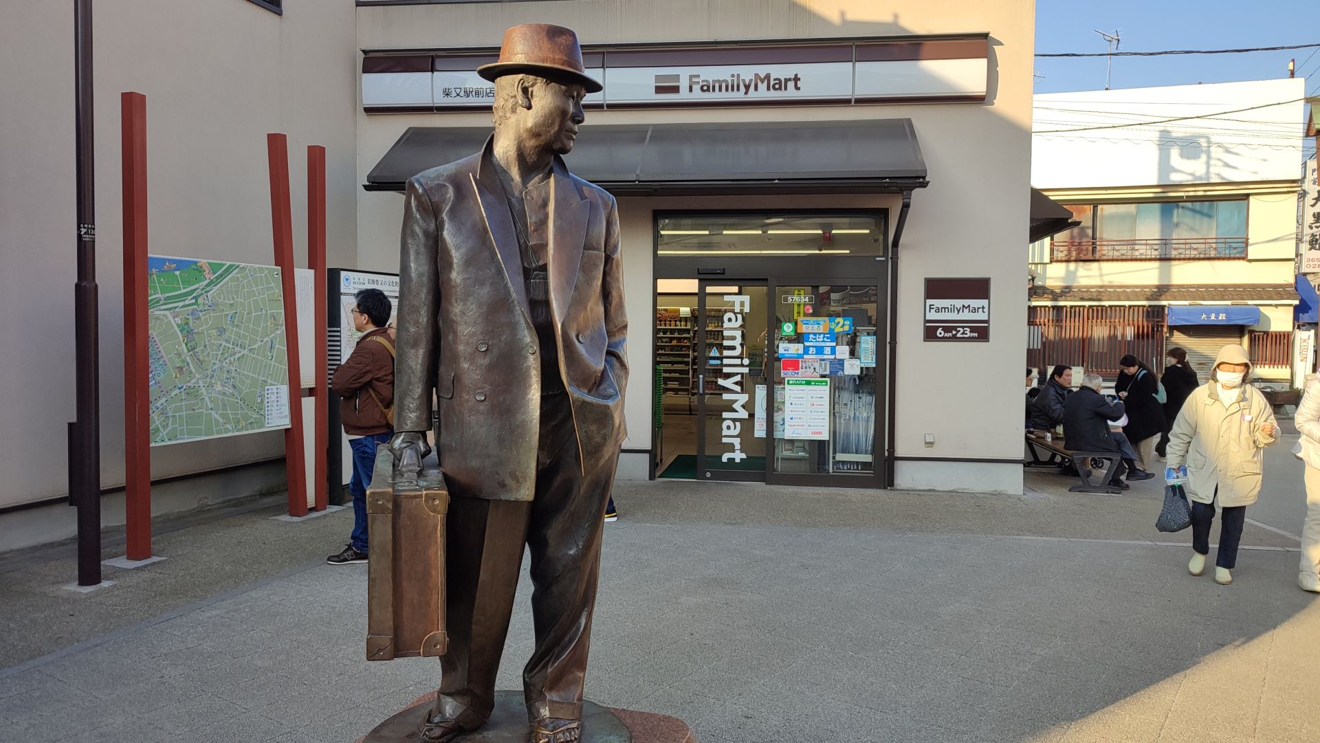 首先映入眼簾的,就是戴帽、提皮箱的銅像——《男はつらいよ》主角「寅次郎」。他彷彿依舊在旅途中歸來,笑著迎接訪客。