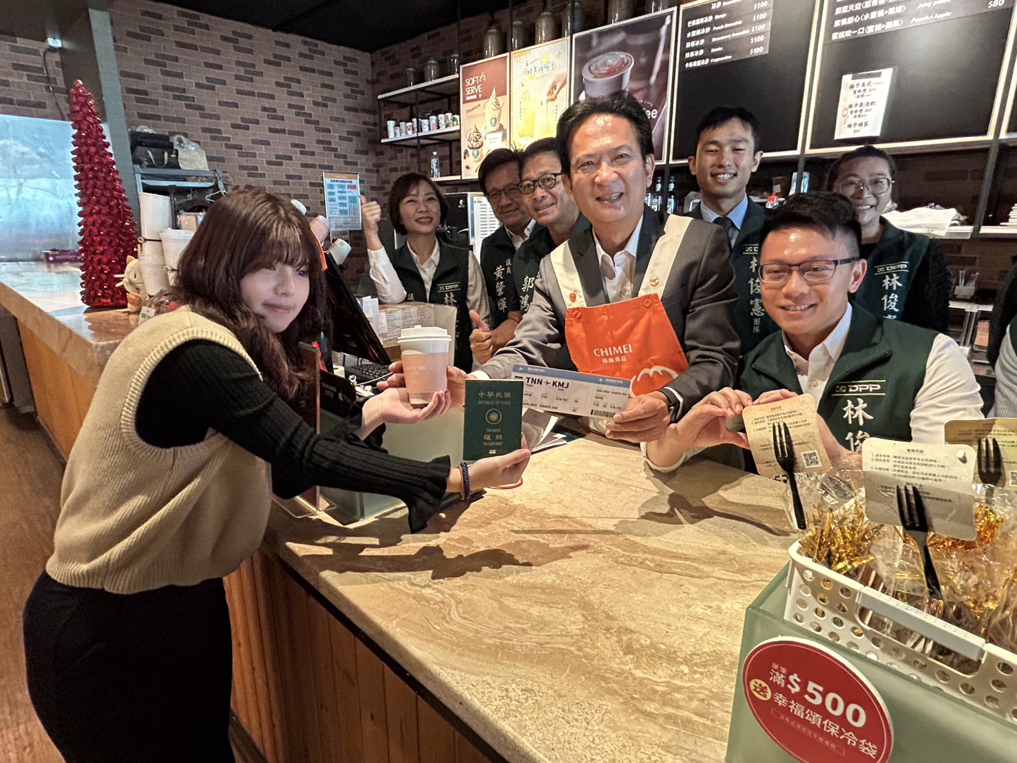 ▲林俊憲推廣台南機場航線觀光 奇美食品幸福工廠加碼憑機票換咖啡。(記者黃雋淮 攝)