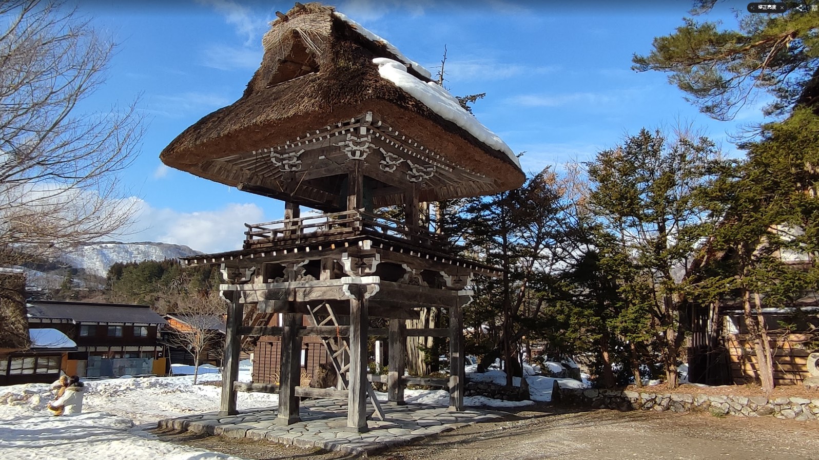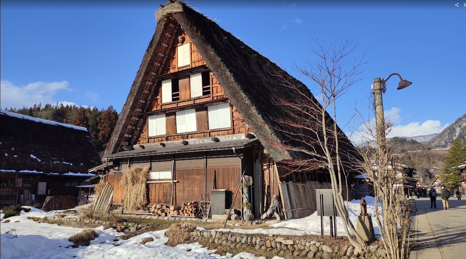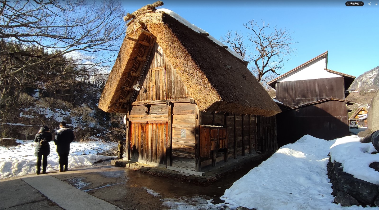 遊客沿著石板道路漫步,耳邊僅剩踏雪微響,四周是覆雪的木造房舍與遠山林海,景色純粹得令人屏息。