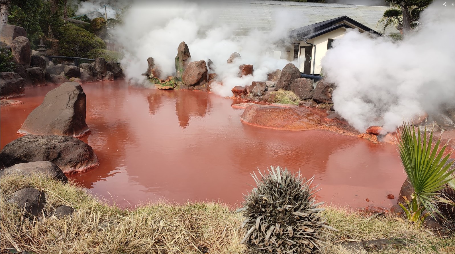 泉溫高達攝氏78度,富含氧化鐵與氧化鎂的高溫熱泥,使整座池面呈現如血般的深紅色。