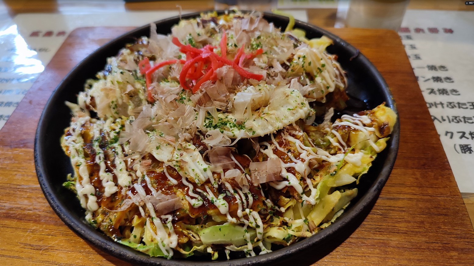 店內好み焼き以關西風為基底,融合廣島燒大量蔬菜堆疊作法,外層微酥、內部柔軟濕潤。