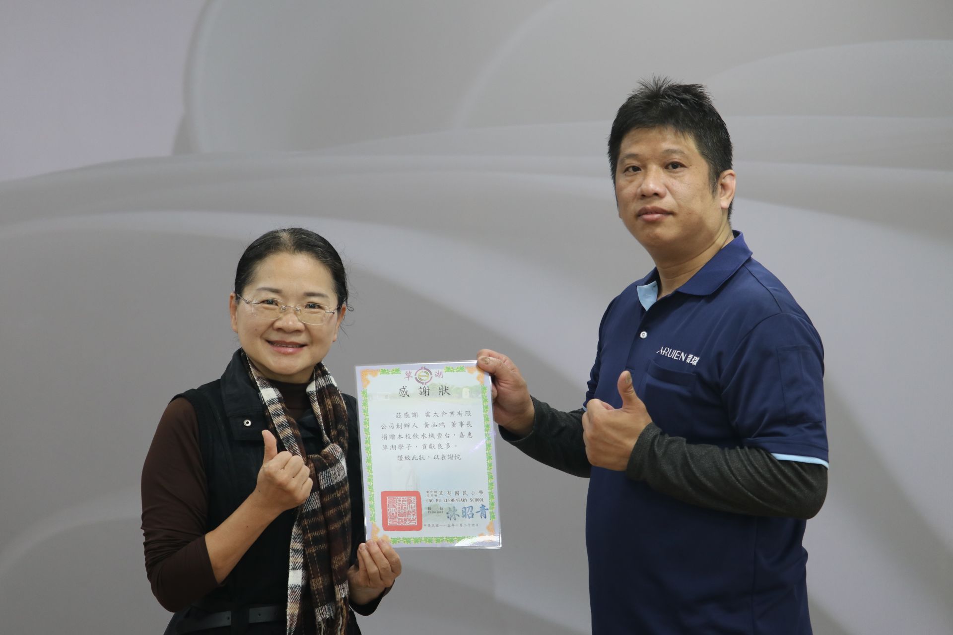 ▲草湖國小林昭青校長 頒發感謝狀 愛瑞恩國際股份有限公司董事長黃品瑞/ 覞傳媒 照片提供