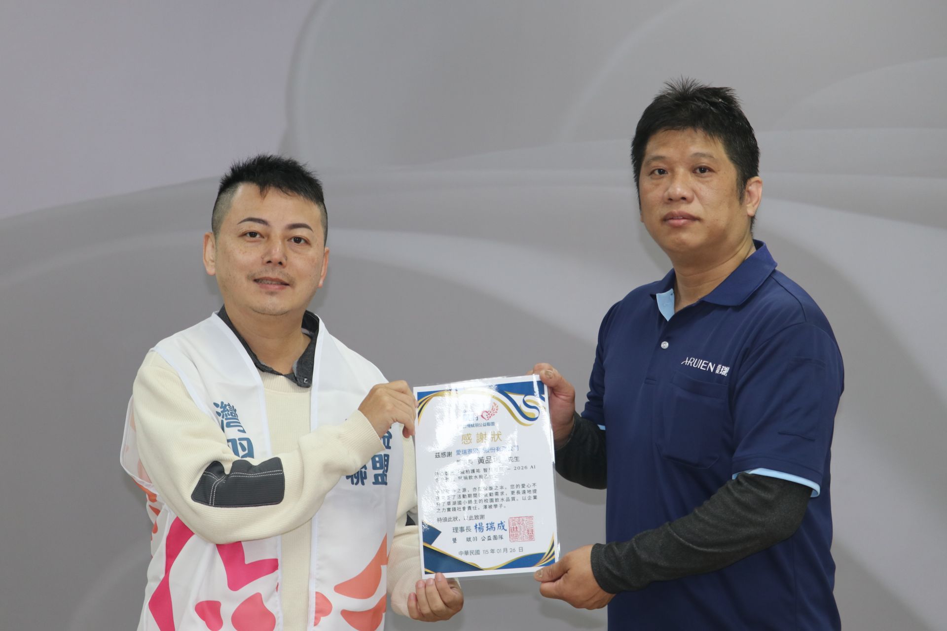 ▲ 台灣賦羽公益聯盟理事長楊瑞成頒 發感謝狀給 愛瑞恩國際股份有限公司董事長黃品瑞/ 覞傳媒 照片提供