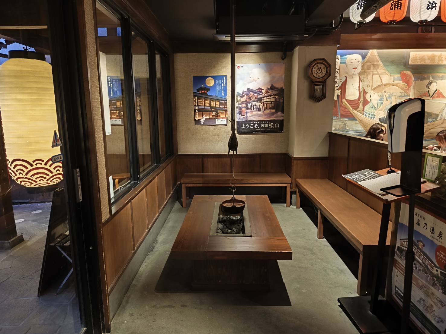 店面以復古木造外觀搭配暖黃燈籠裝飾,門口高掛「道後橫丁」與「瀨戶內鄉土料理」字樣,