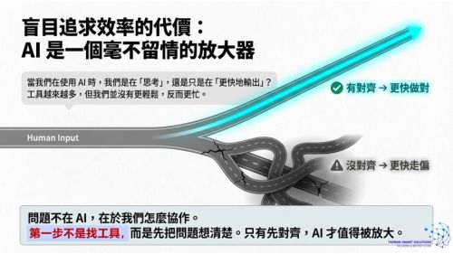 我和無數台灣中小企業負責人對話,聽到的故事幾乎一模一樣:「我們投資了 AI、導入了工具、辦了工作坊,但什麼都沒改變。」工具跑得更快了,員工卻更忙了,轉型從來沒有真正發生。我們買了法拉利,但沒有人給我們一個叫做「對齊(Alignment)」的方向盤——於是我們以全速撞上了牆。